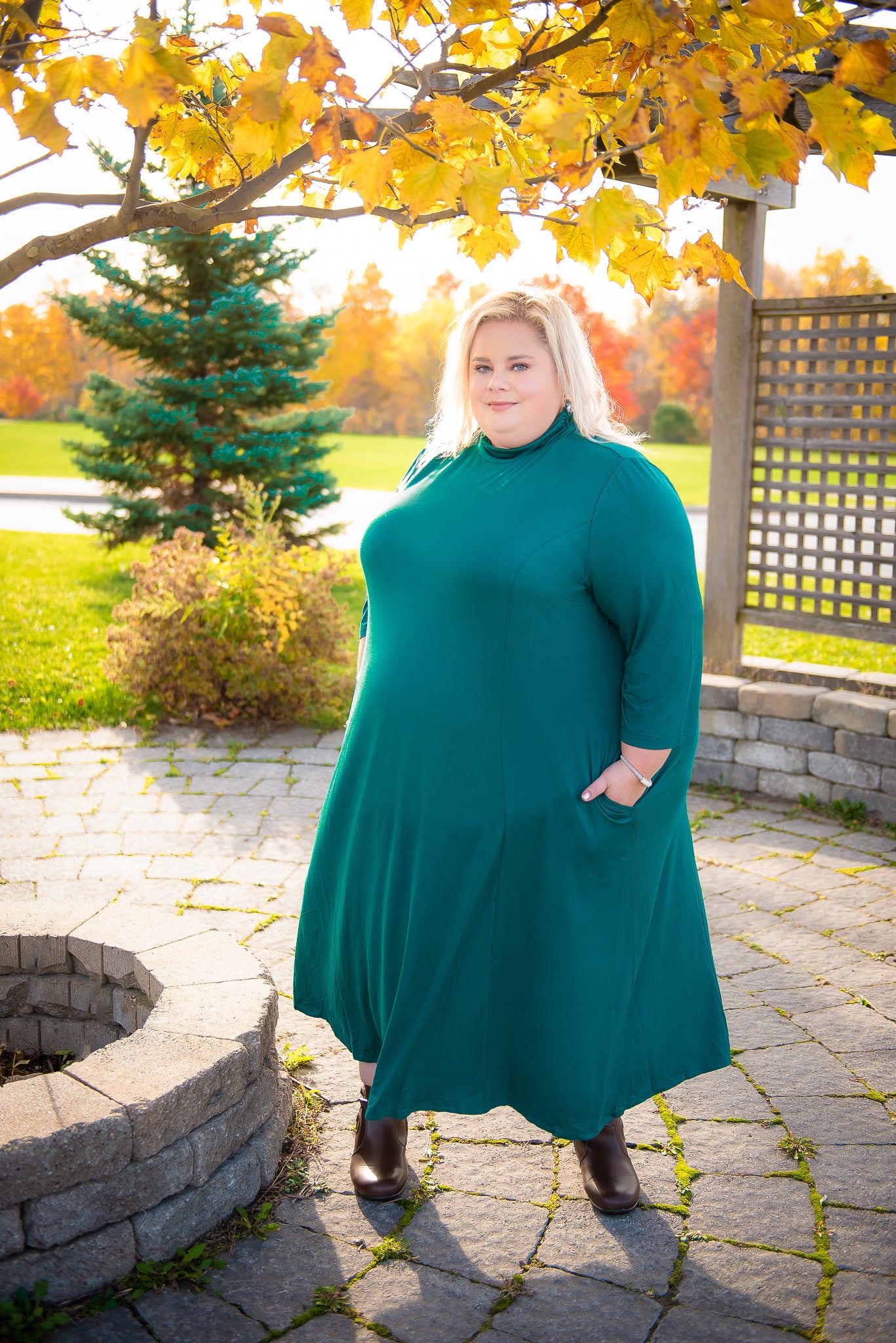 Soft jersey knit dress with 3/4 sleeves, a line silhouette, mock neck and pockets. Midi length. Only worn to take these photos