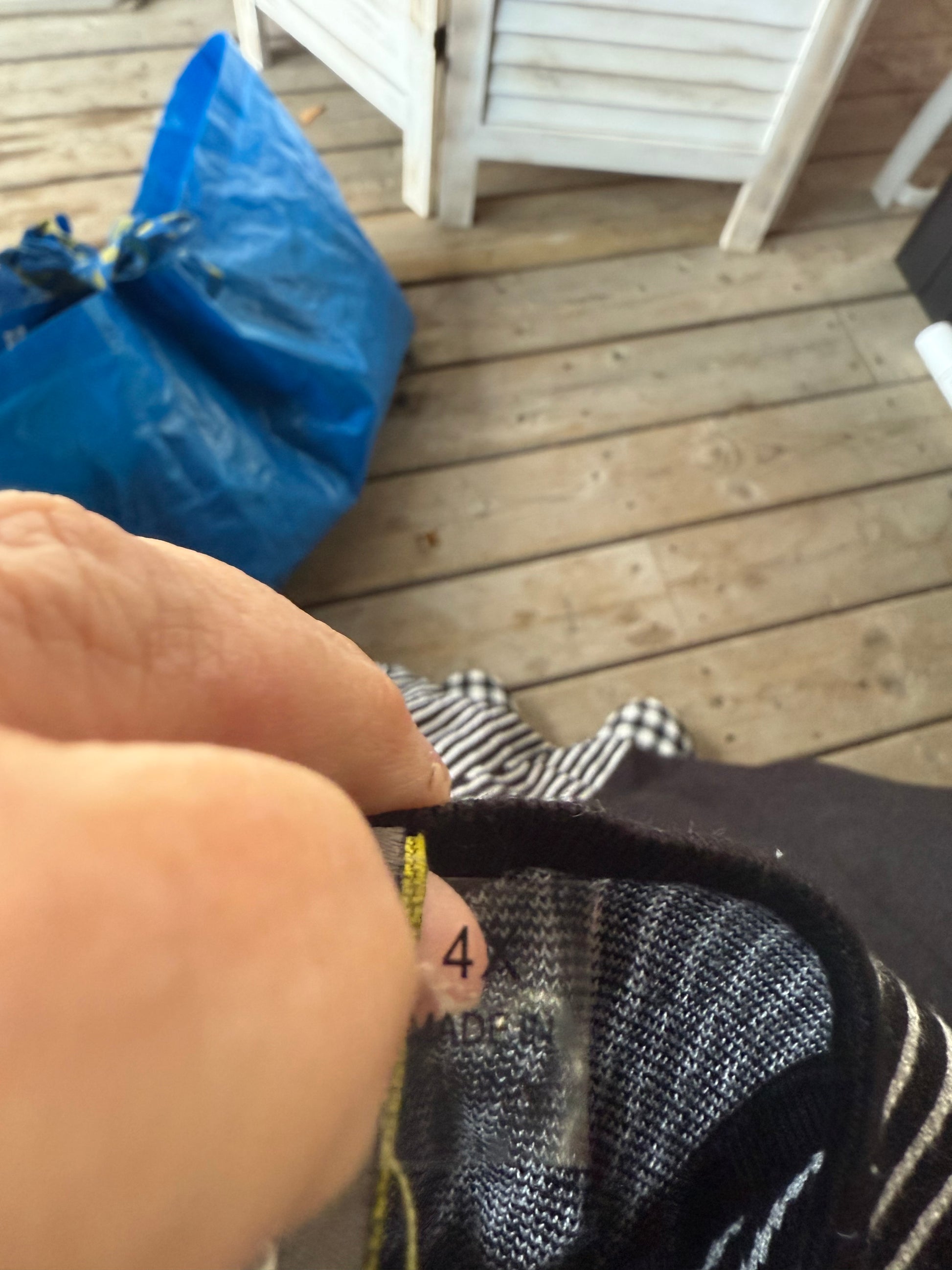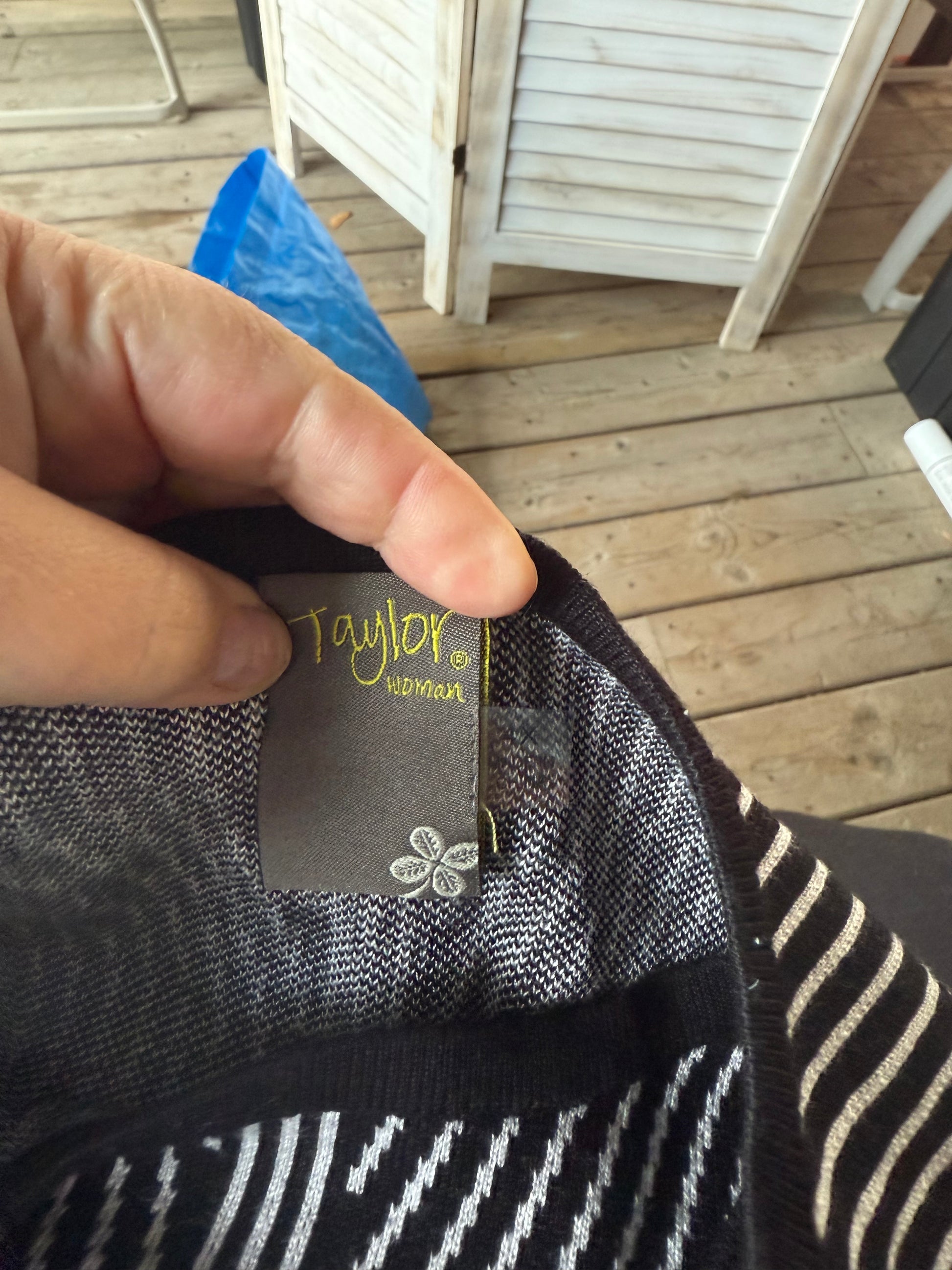Black sweater dress with white stripes that accentuate your curves. Knee length, 3/4 sleeve.