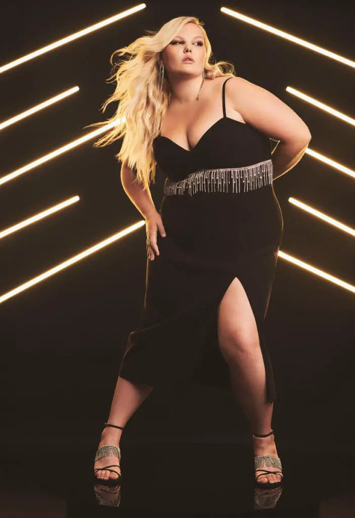 This dress is a limited edition piece from ELOQUII’s Collector edition. Black slip dress with adjustable straps, jewelled rhinestone detail at the bust and a thigh high slit. Fabric has a good amount of stretch to it.