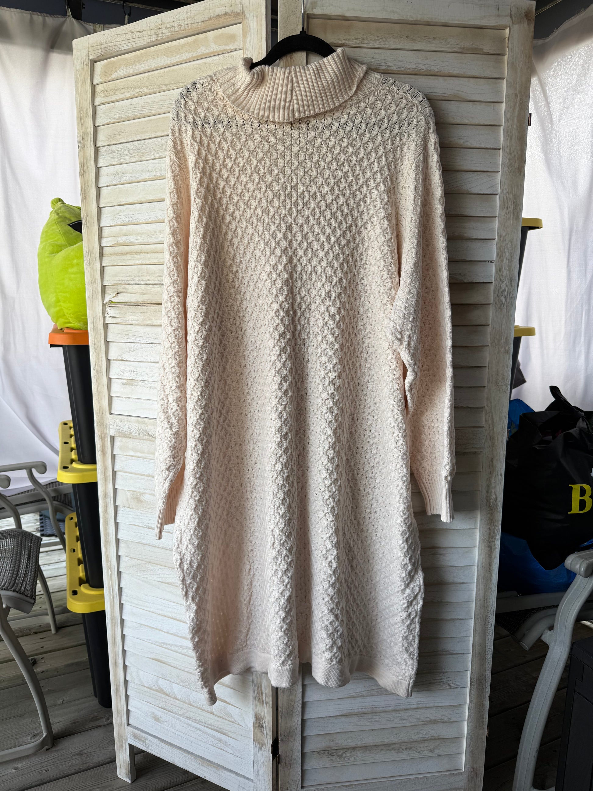 The perfect weight sweater dress (not too heavy or light!) with a turtleneck and long sleeves. Knee to midi length depending on height and long sleeves.
