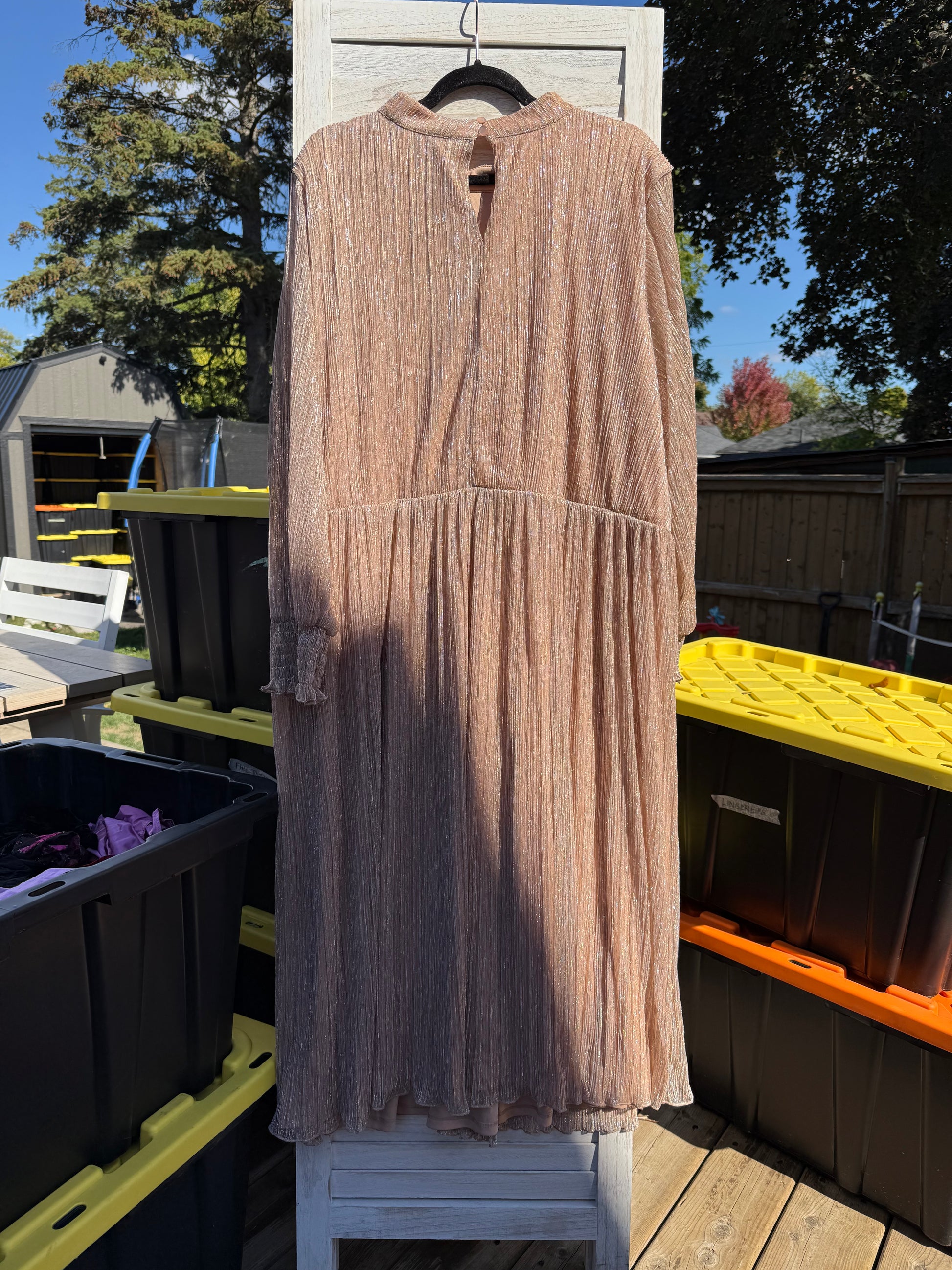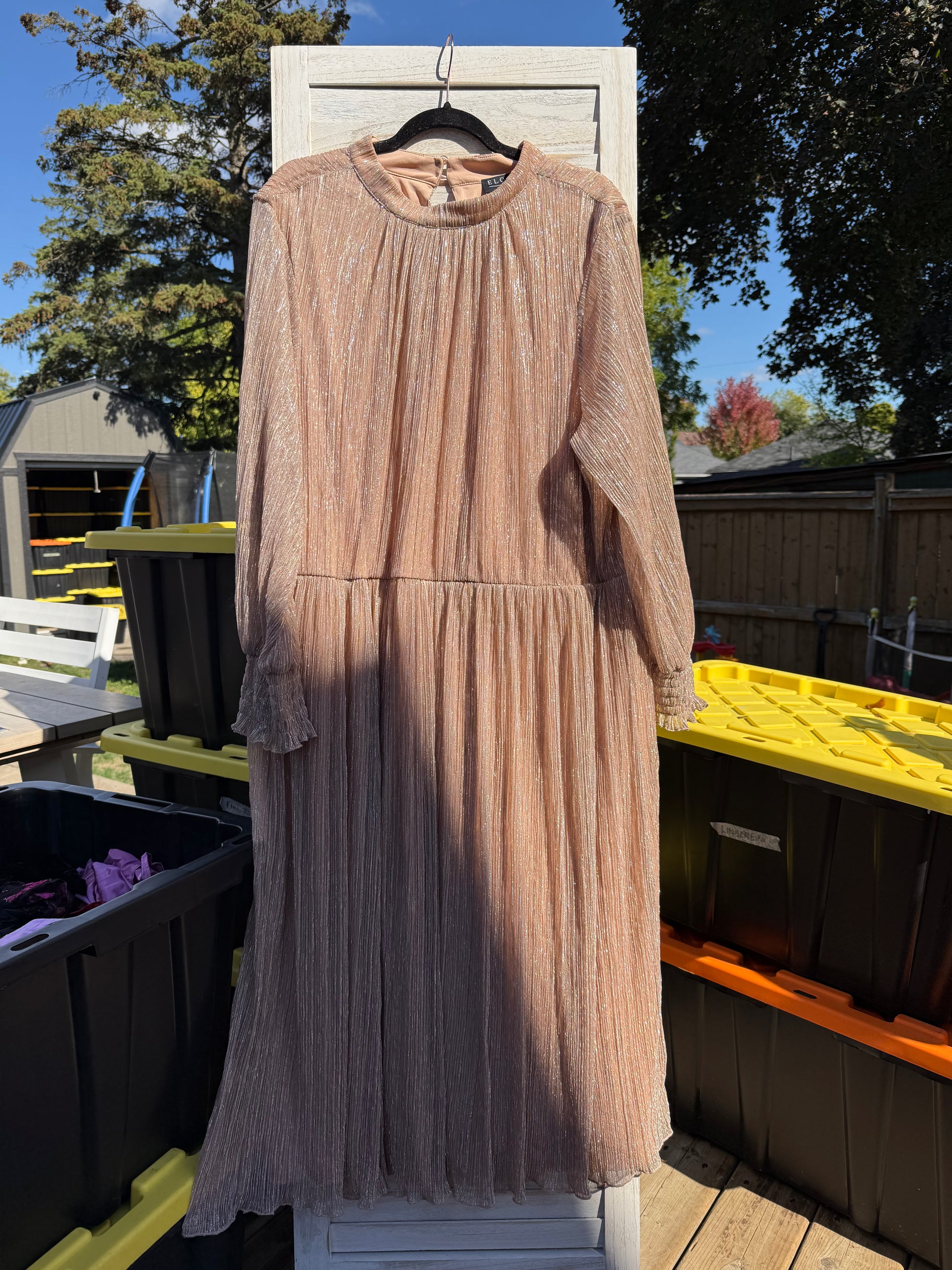 Beautiful rose gold dress with metallic thread and plisse fabric with stretch, long sleeves and high neck. The dress has a stretchy full lining except for the sleeves. Only worn to take these photos.