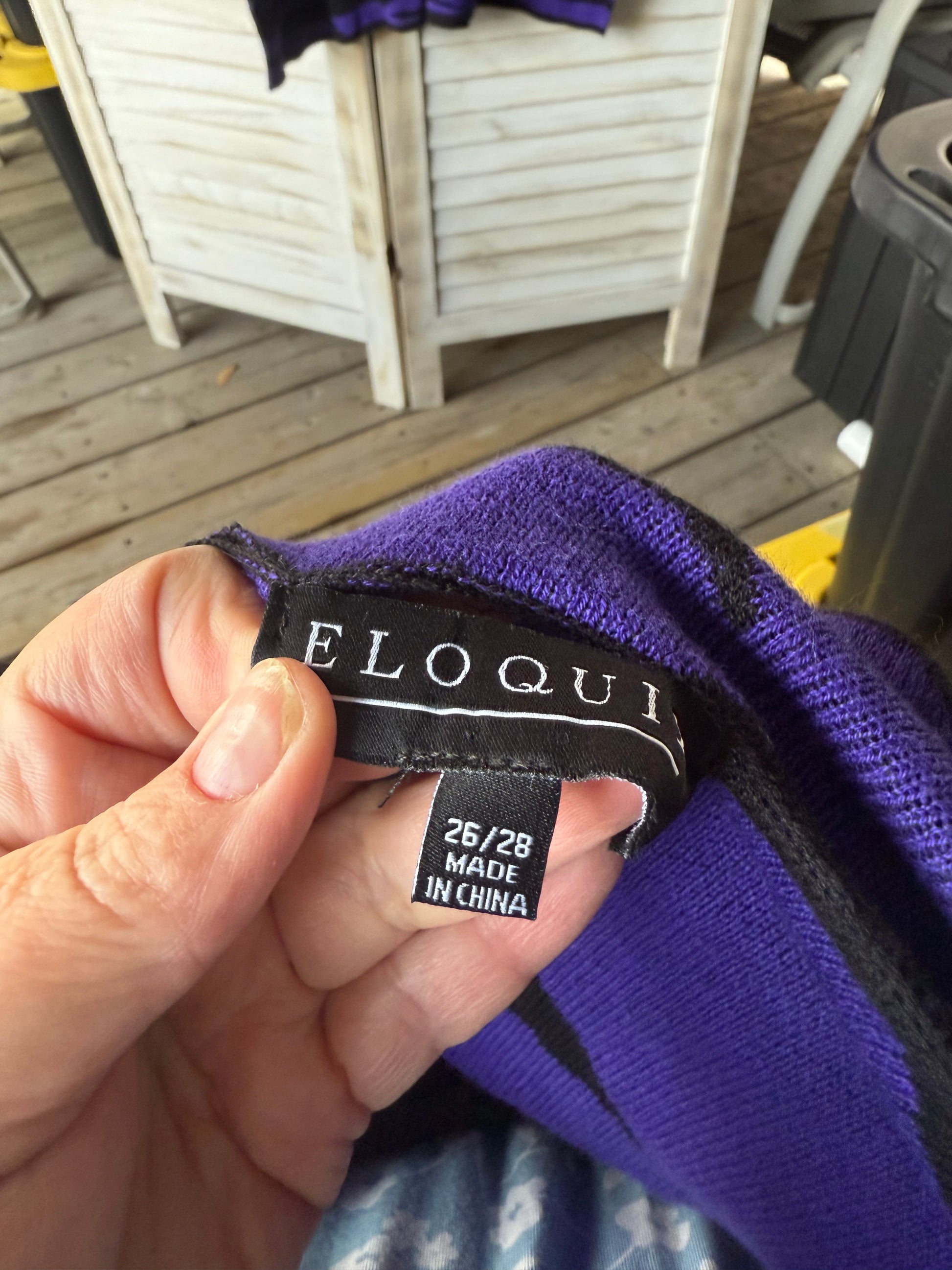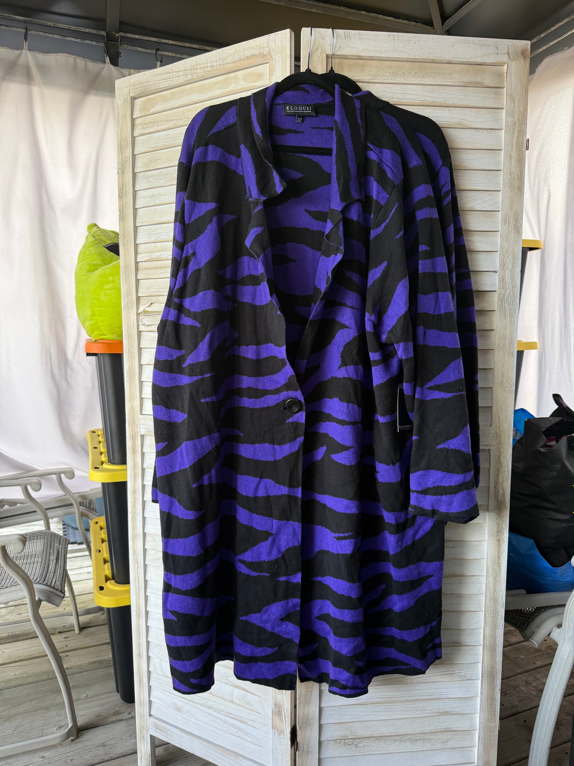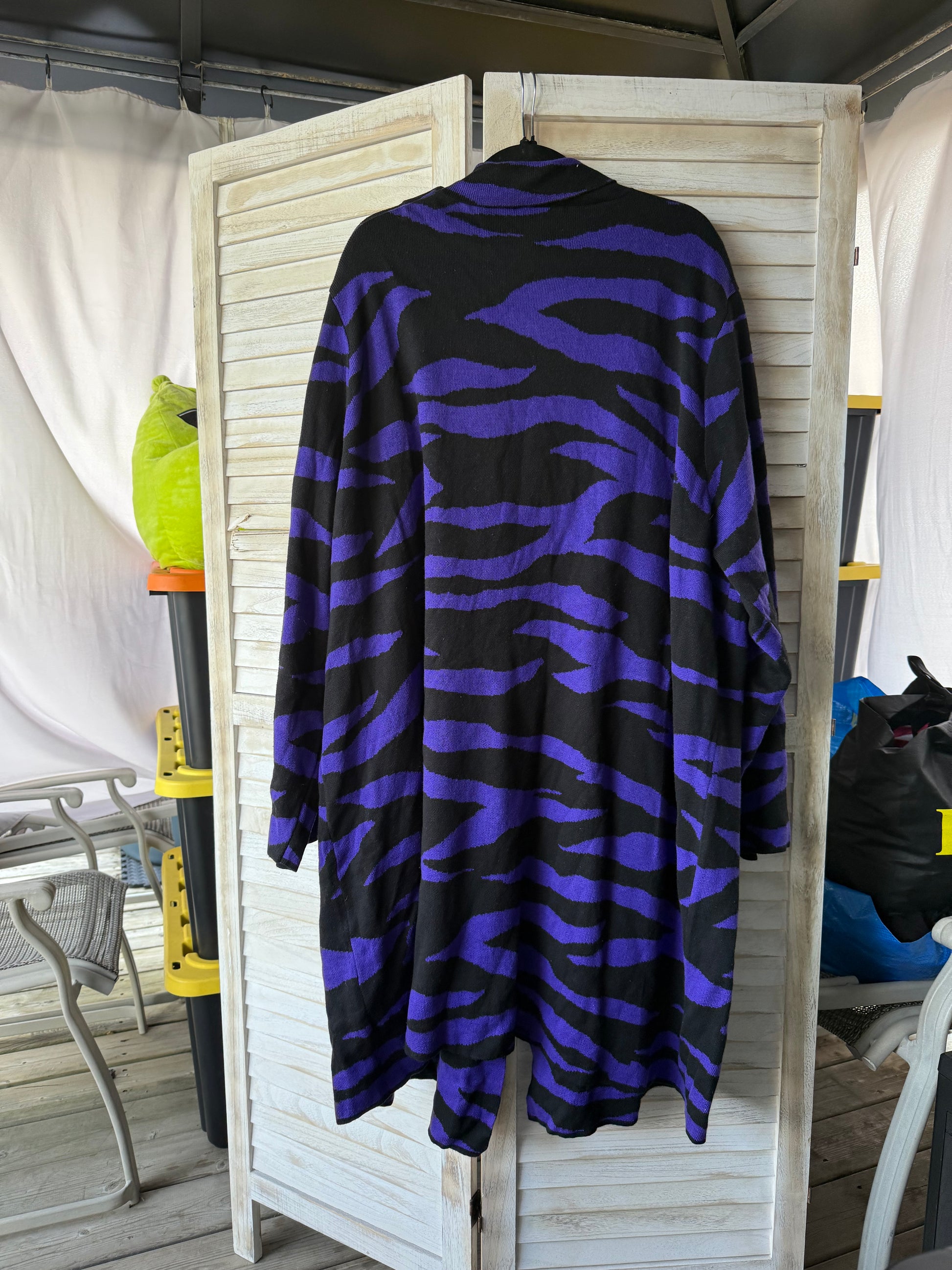 Midi length cardigan with button closure and lapel neck. Fun purple and black zebra print. Matching sweater dress available in a separate listing.