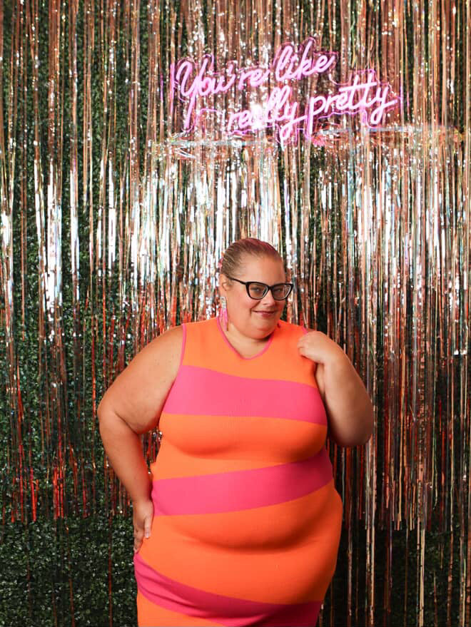 Orange and pink sleeveless sweater dress with a round neck and lots of stretch, midi length. High quality knit. Only worn for this event.