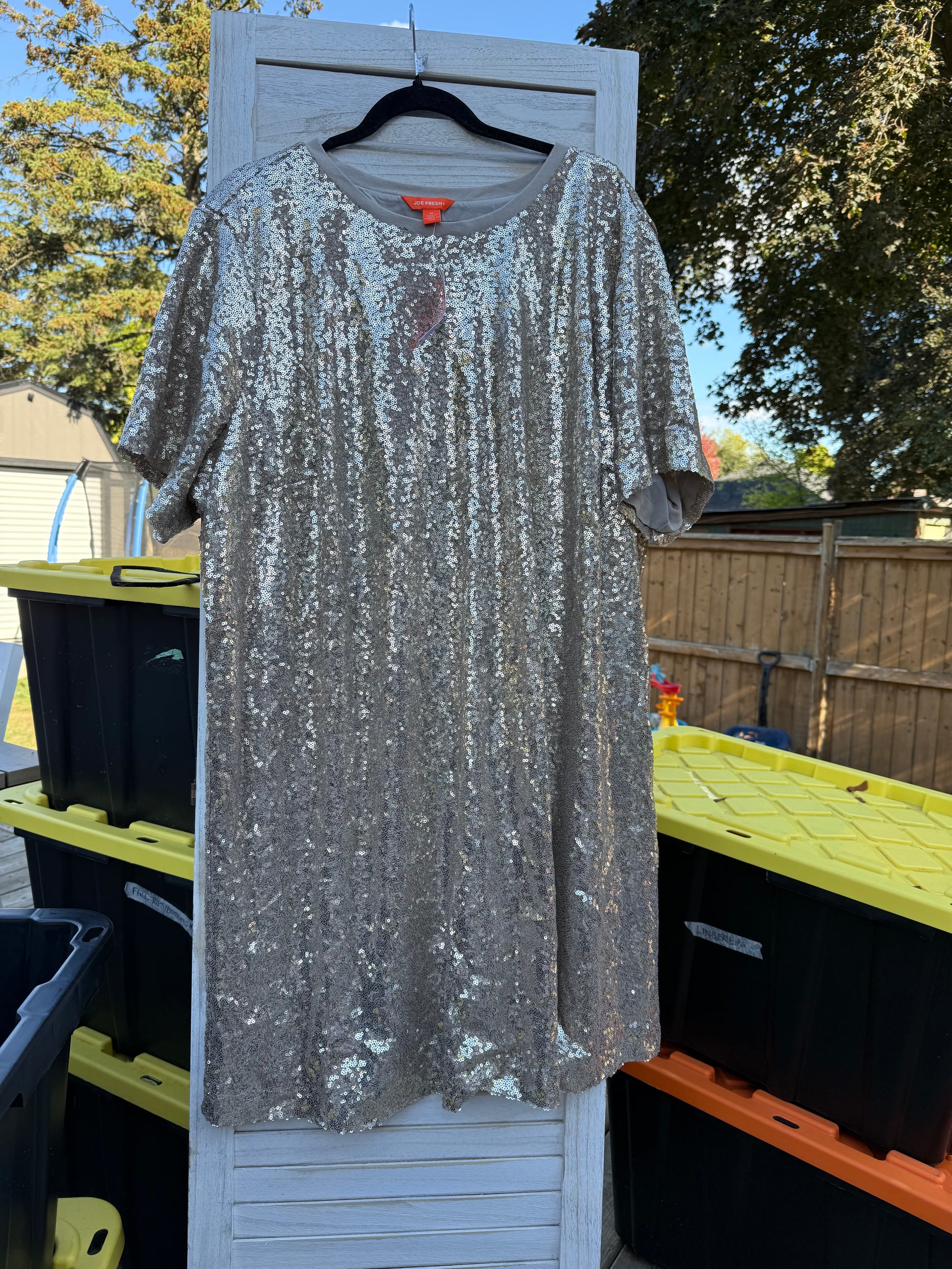 Perfect for the upcoming holiday season or just because you love a little sparkle! Crew neck tshirt style dress, knee length.