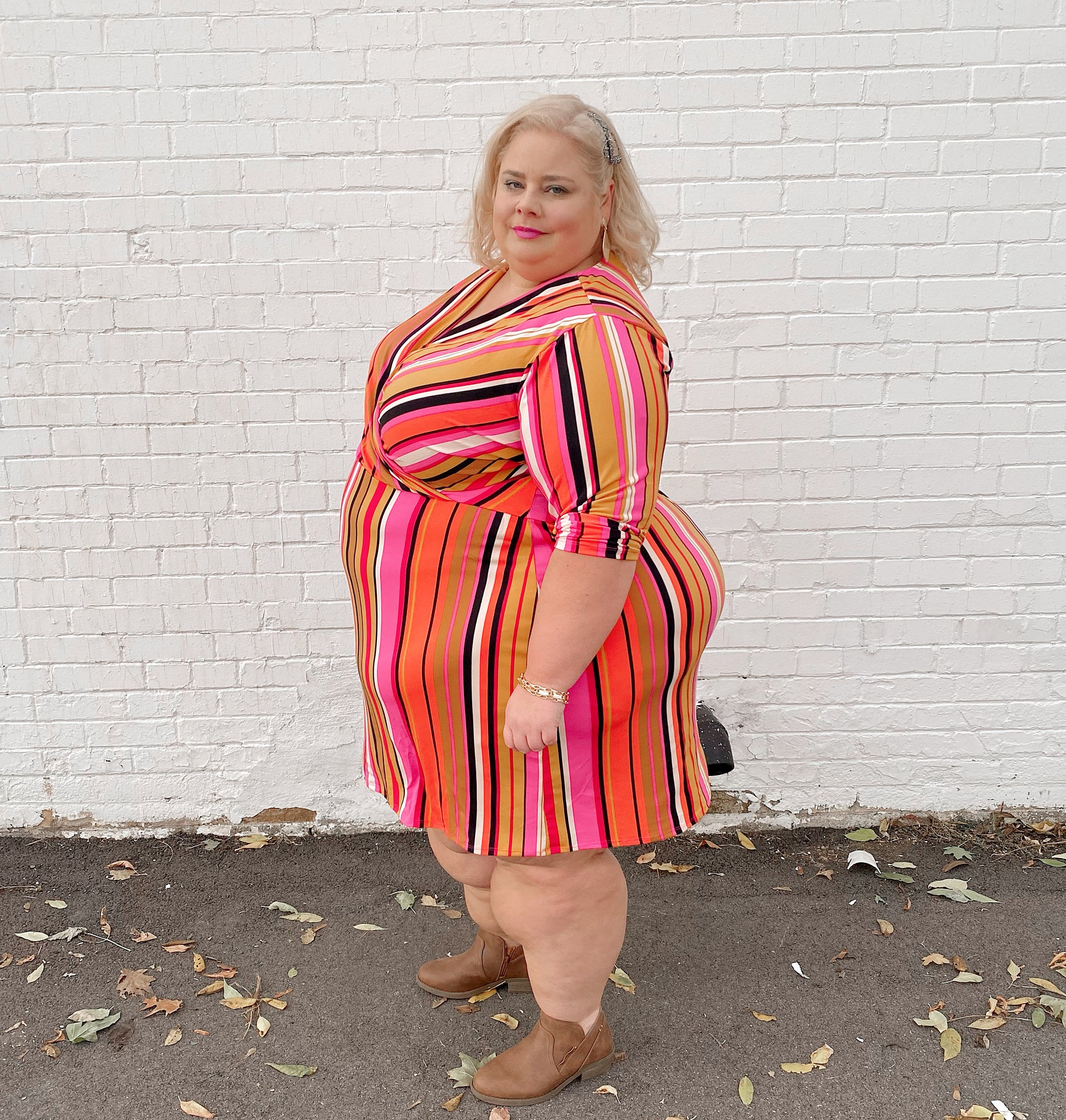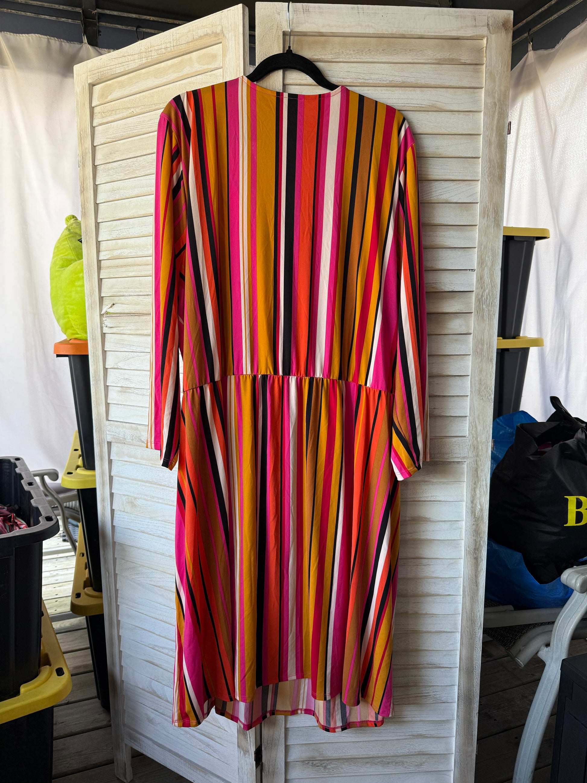 Warm toned striped knee length dress with v-neck surplice neckline and long sleeves. Stretchy fabric