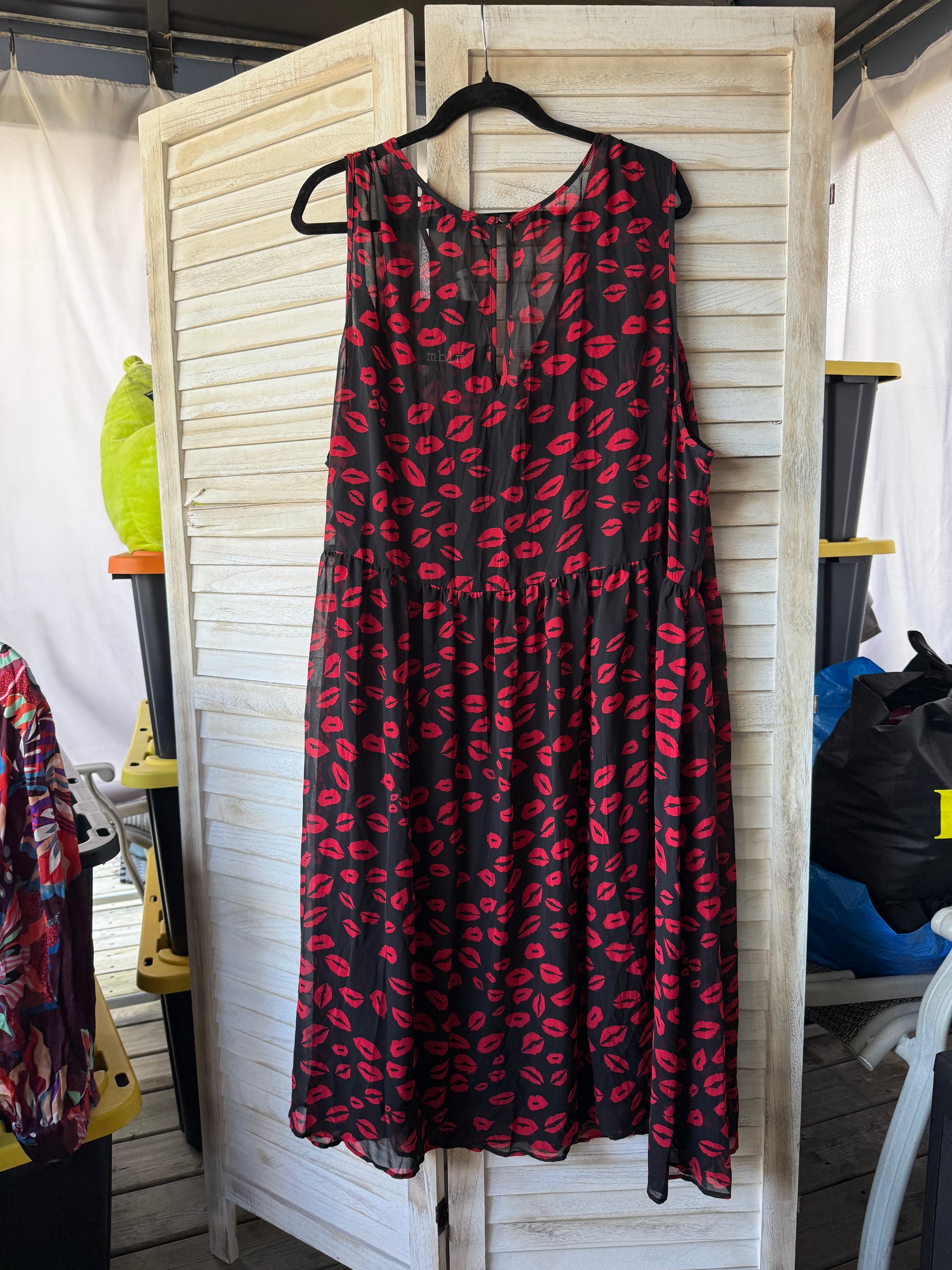 Sleeveless lip print sheer dress with separate slip underneath. MBLM is an oldie but goodie line from Pennington’s.