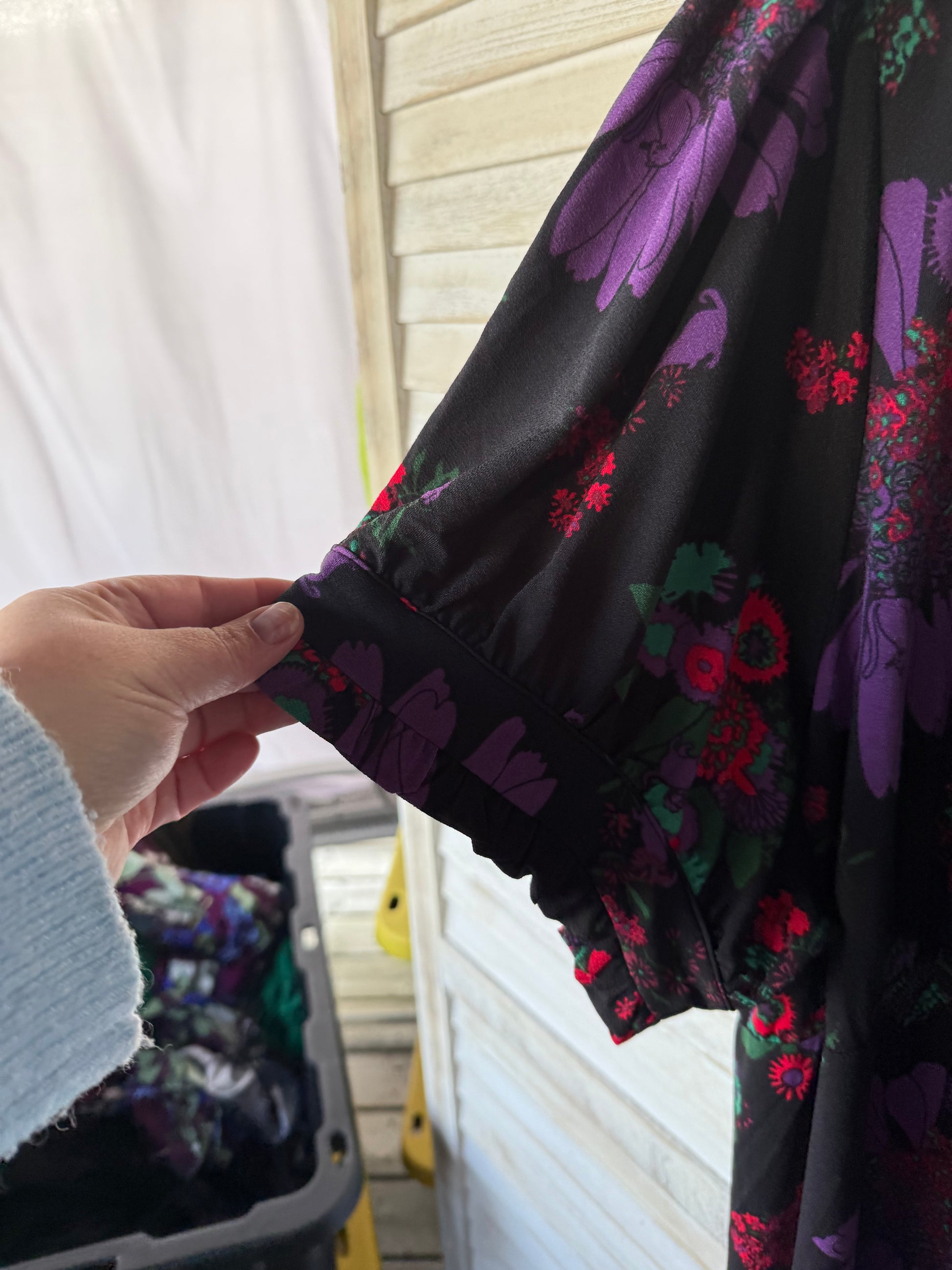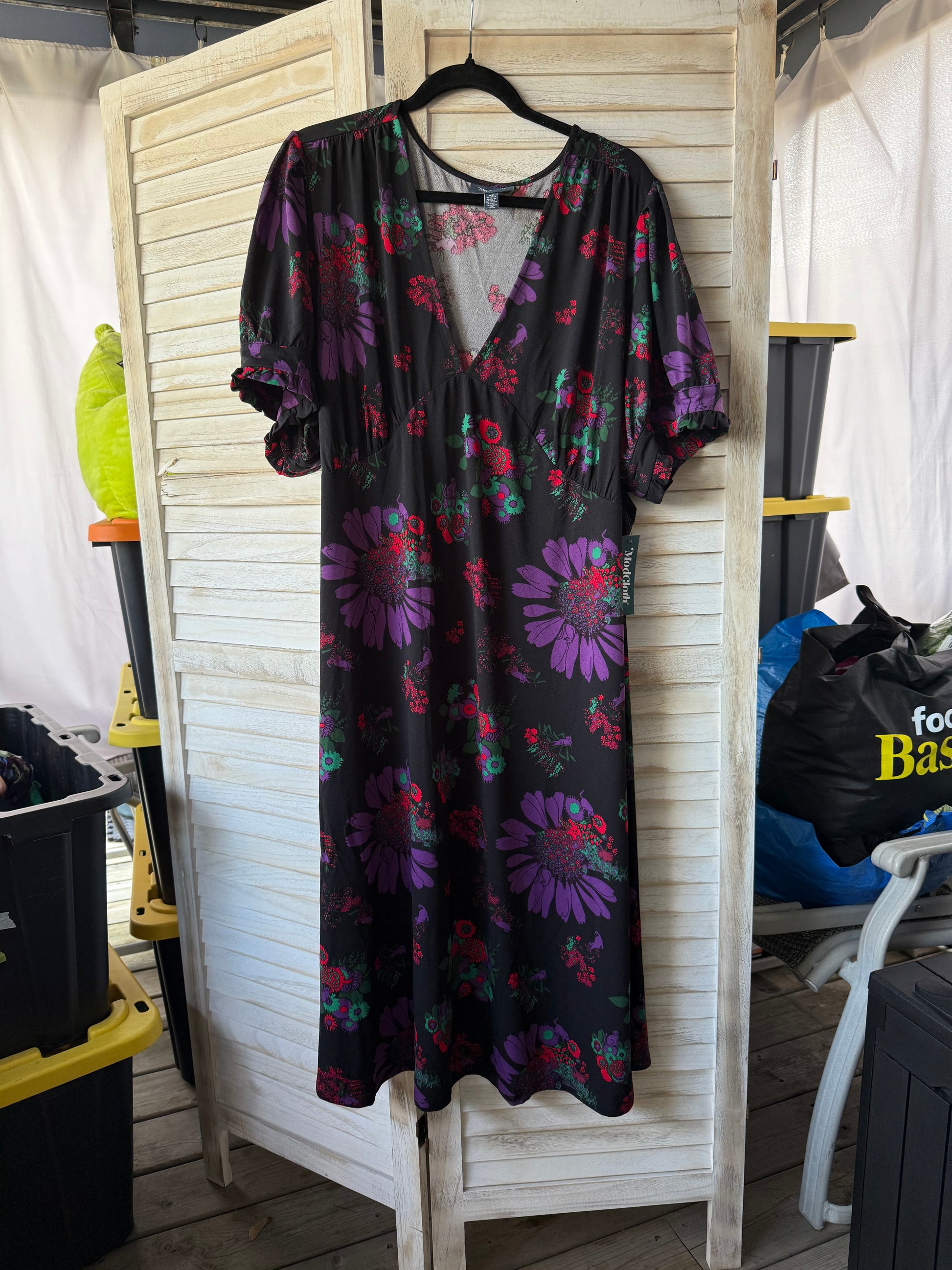 Fit and glare empire waist jersey knit dress in a black floral print. Short sleeves with ruffle detail.