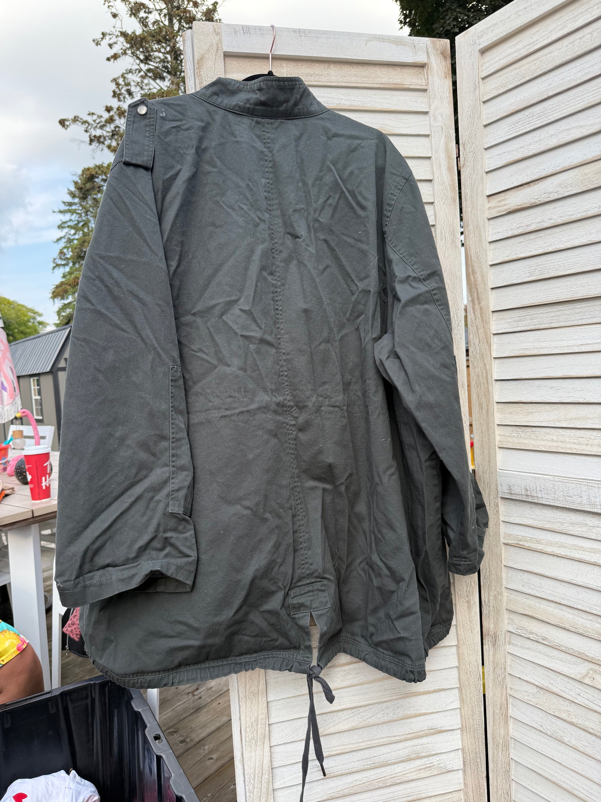Great multi purpose fall jacket in a grey/army green colour with sleeves that can be rolled up to 3/4 length, an adjustable waist and bottom. Has a zipper and snaps.