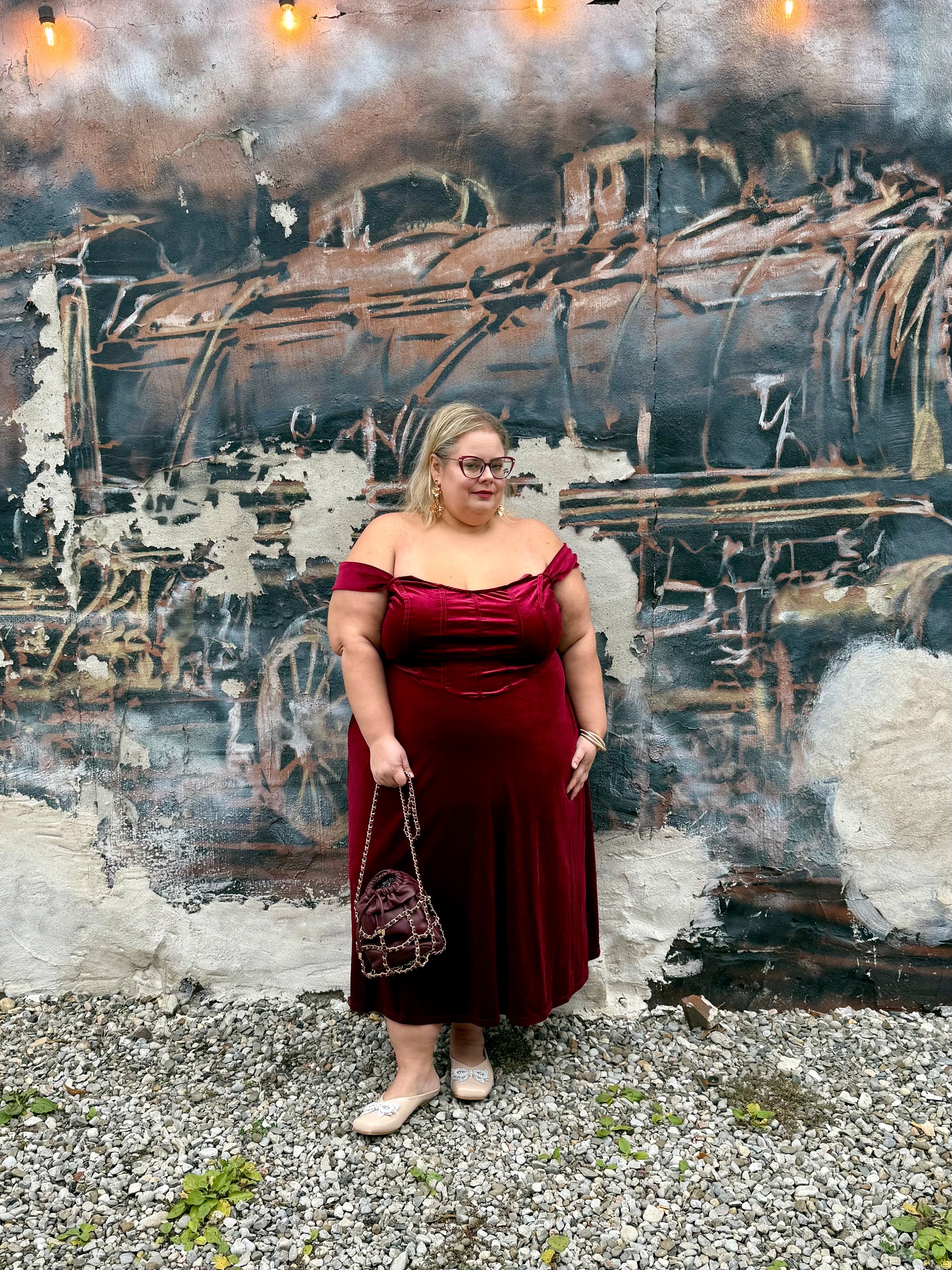 As seen on my recent IG post! This dress has an off the shoulder corset style bodice with adjustable back and off the shoulder sleeves. Skirt is midi length. Soft stretchy velvet fabric. Only worn to take these photos