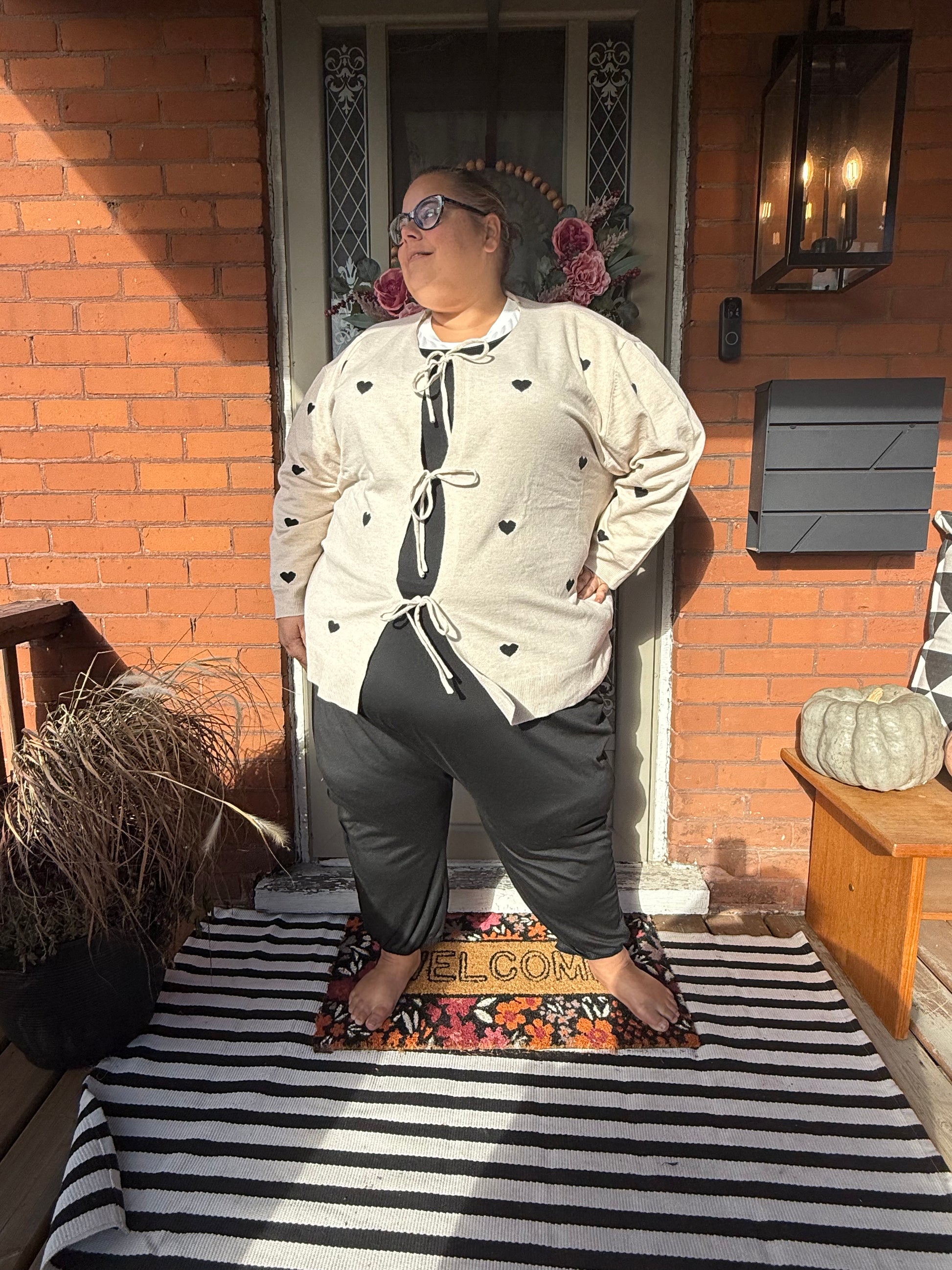 Lightweight tie front beige cardigan with black hearts on the front only. Just wore to shoot these photos.