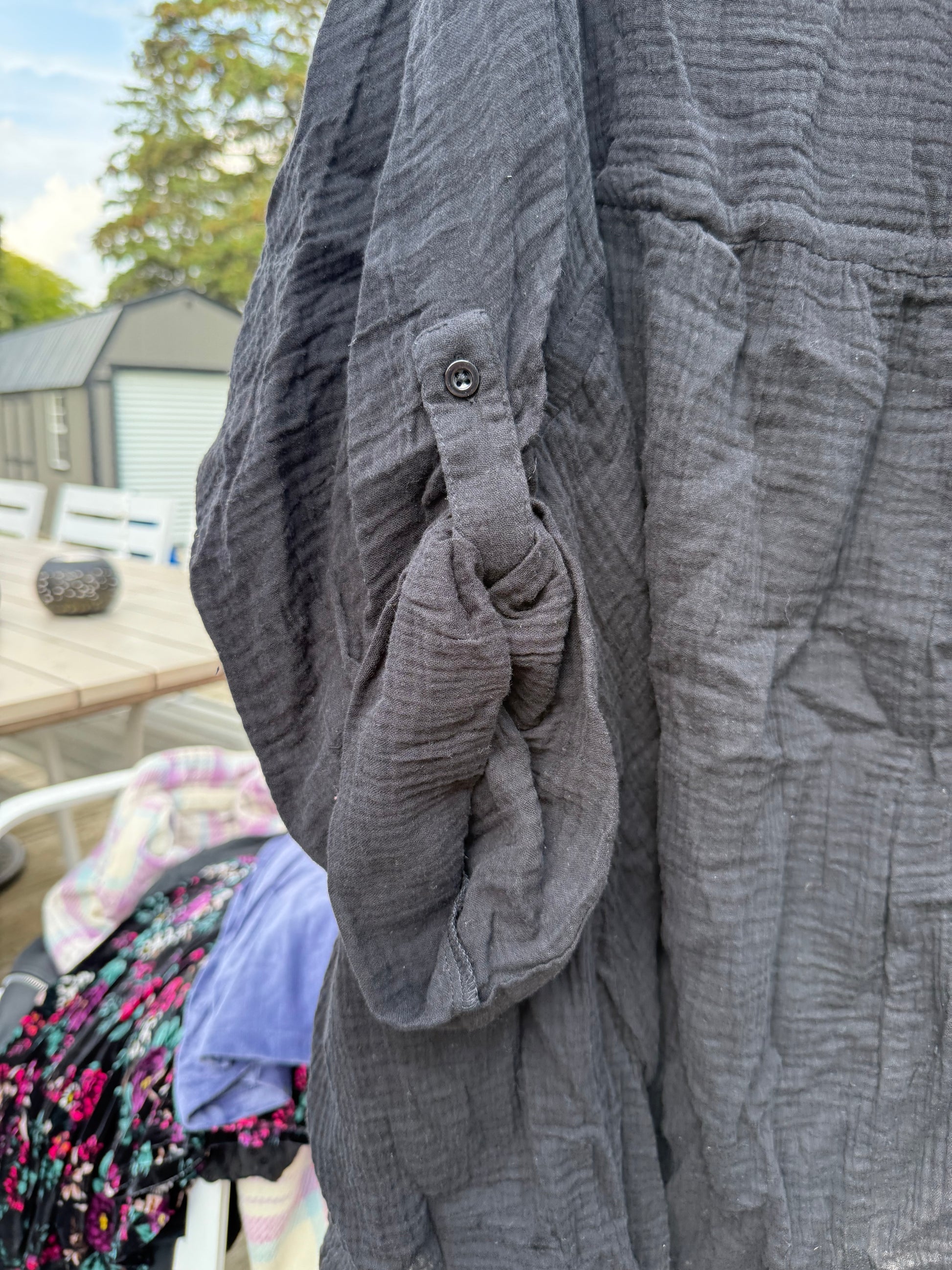 Lightweight gauze jacket or overpiece with adjustable 3/4 length sleeves and tie waist.