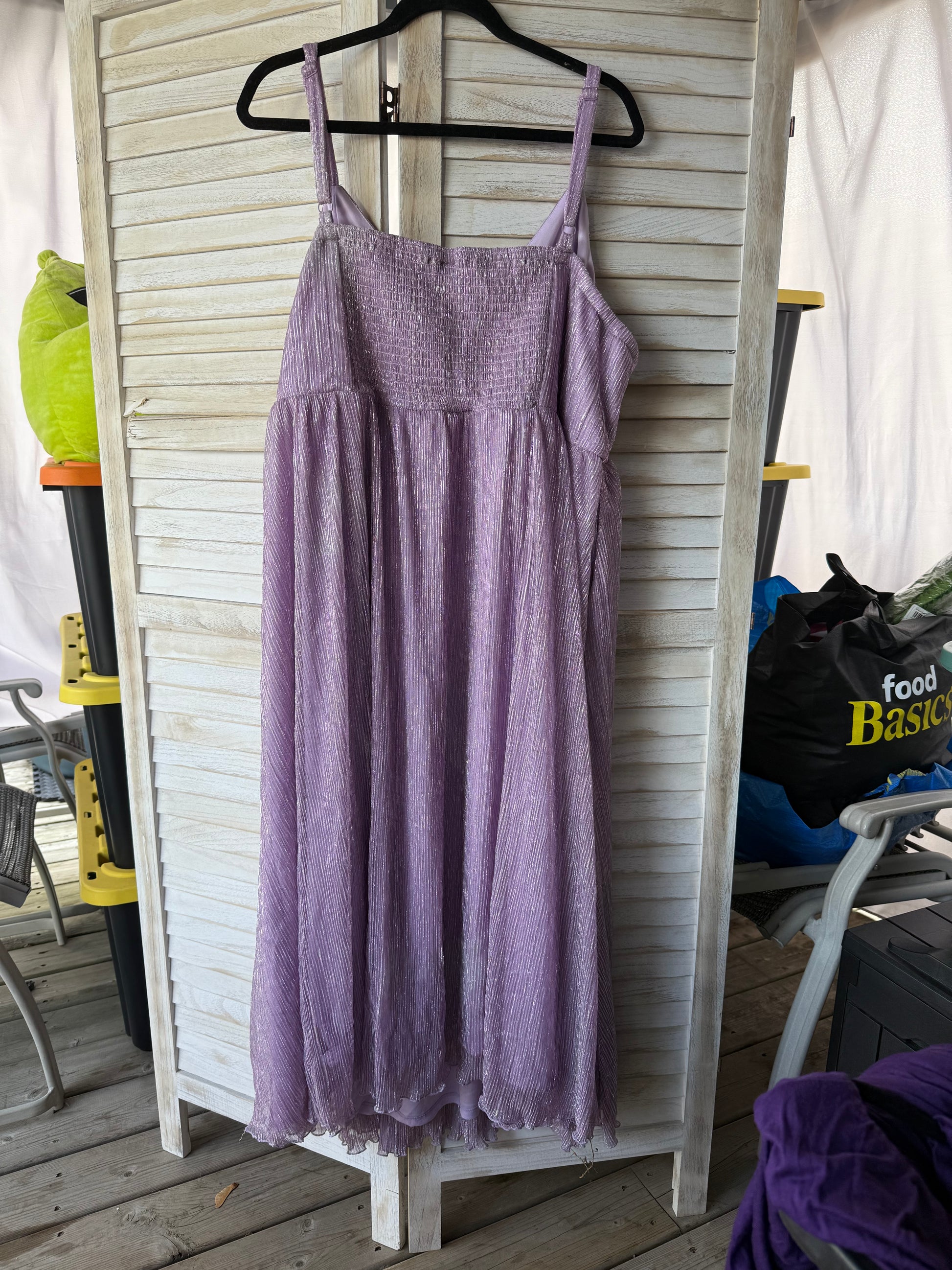 Classic fit and flare with underbust seam and a pleated skirt. Adjustable straps and fully lined, midi length. Fabric has a silver lurex fabric woven in that gives it a great sheen. Only worn for my birthday.