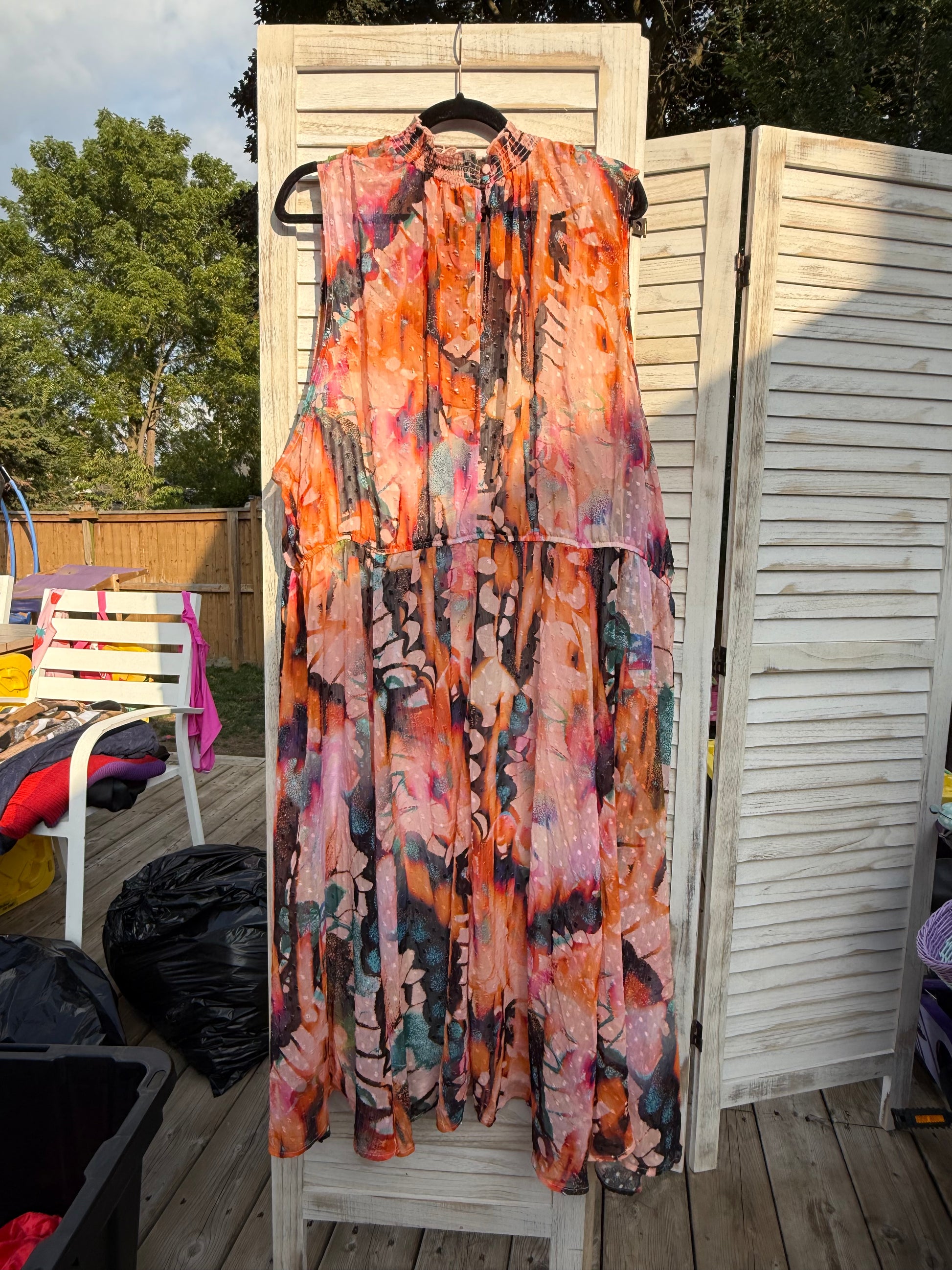 Mock neck, sleeveless chiffon dress with stretchy lining. Beautiful orange print and Swiss dots on the fabric. Midi length