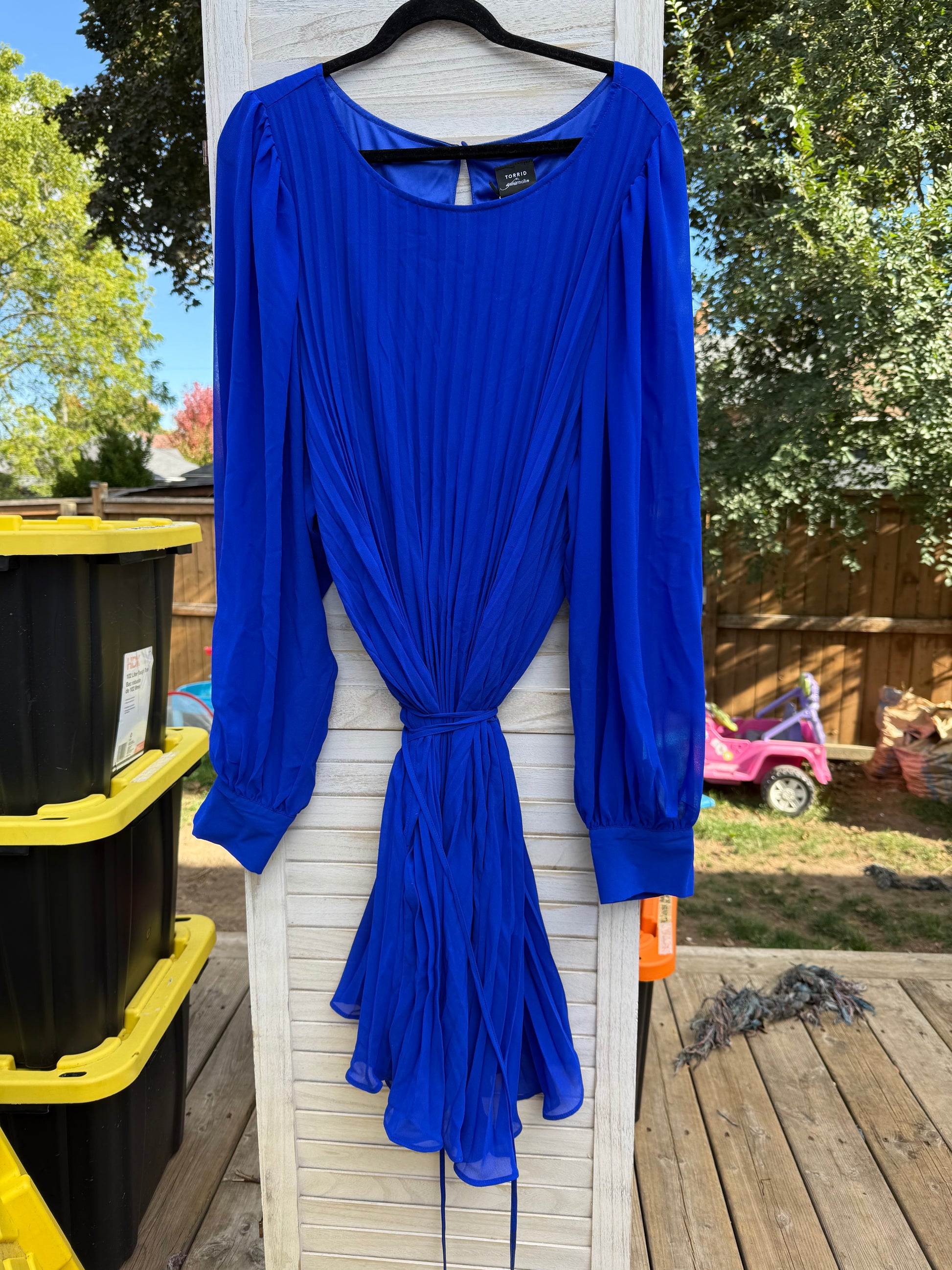 Vibrant royal blue skater dress with long sleeves, pleats and a high round neckline. Comes with an optional belt.