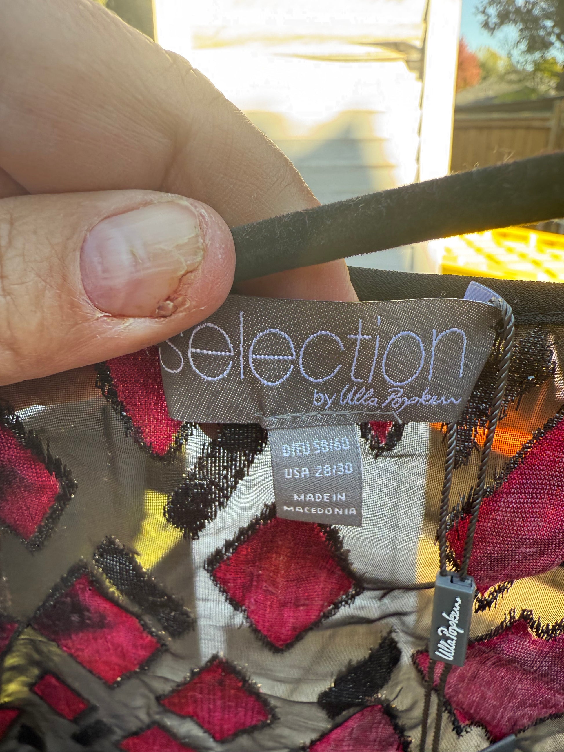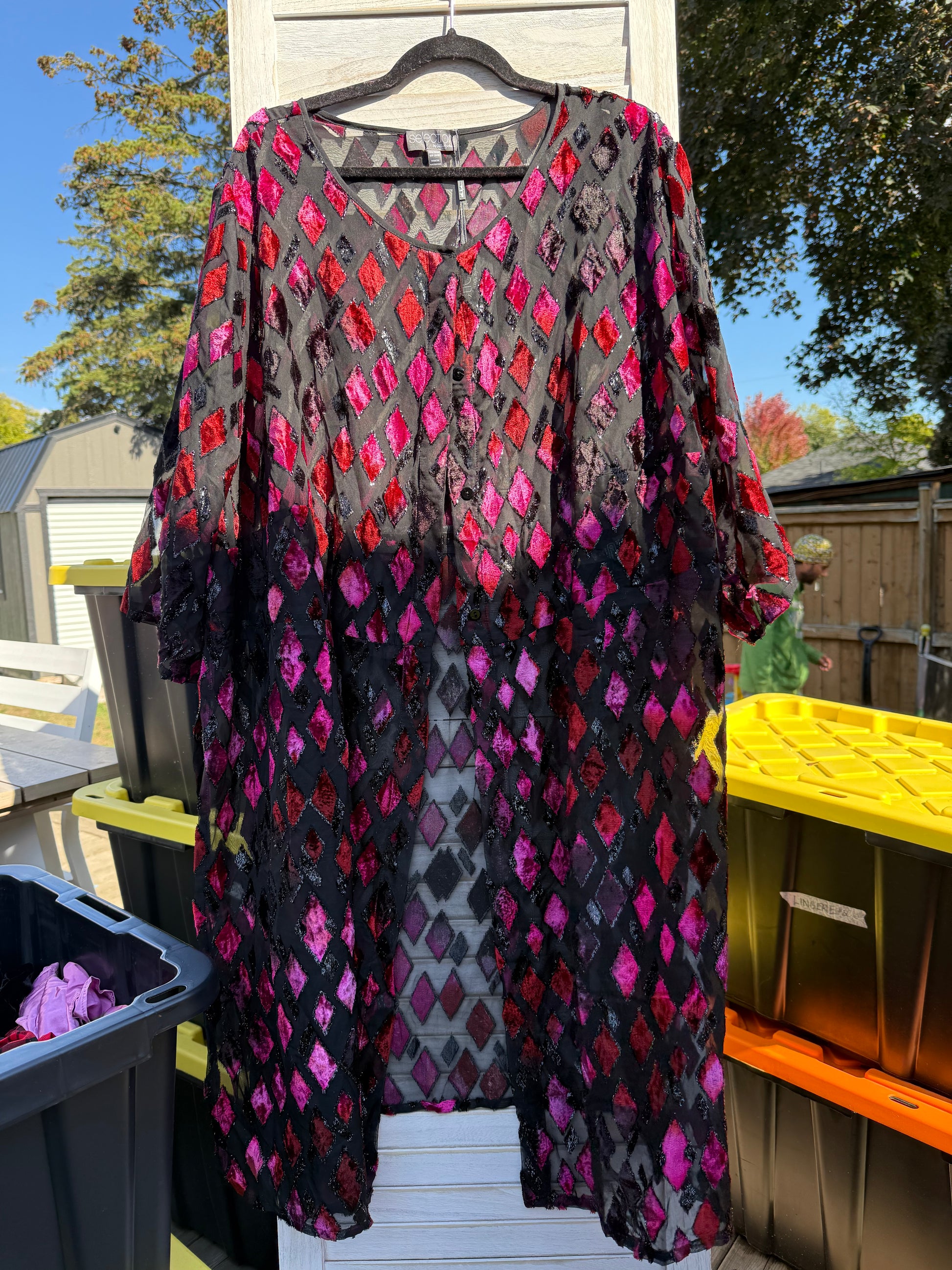 Perfect for the upcoming holiday season this duster from Ulla Popken has a black base with velvet pink & red diamonds embossed on it. It has deep side slits for ease of wear when sitting.
